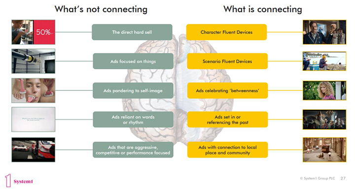 3. The ads that resonate the least right now focus on a 'hard sell' and things over people. The System1 Group research makes it clear that: "this is a time for people, not things". Given society's over-riding health and economic concerns, it is not surprising that commercial spots that indulge in vanity fail to resonate with viewers. Similarly, ads that are aggressive, overly competitive or focused on performance are also failing to resonate with people who increasingly value empathy and shared experience.